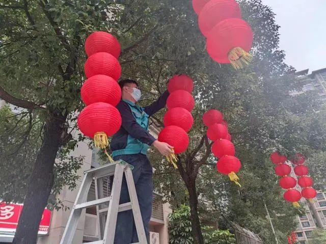 小区园林主要通过节气灯笼的布置来渲染浓厚节日气氛。从主入口处开始悬挂红色灯笼,根据人行动线,拉网式延伸铺通至园林主干道,打造灯笼通道效果。营造出一种欢快、温馨惬意的新春节气。