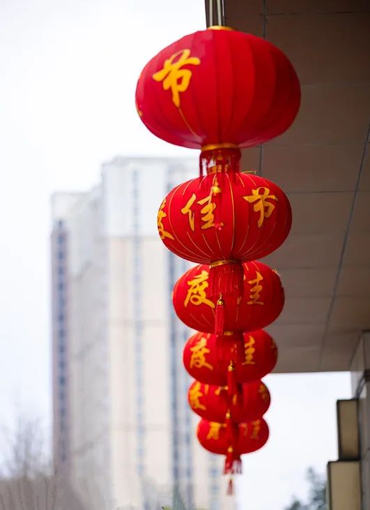 以传统中国家庭式门面布局为主,大堂玻璃门张贴以新春吉庆元素为主的年味窗花,同时在每栋大堂出入口顶梁各悬挂大红灯笼两个,体现节日气氛,营造高雅、简洁的装饰风格。