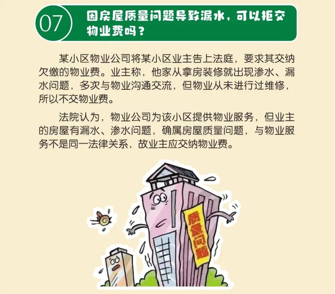 法院认定:法院审理认为,物业公司与王某之间是物业服务关系,而开发商与王某之间是商品房买卖合同关系。物业公司与开发商是两个独立的民事主体,如果房子存在质量问题,应该找开发商,而不是物业公司。不能将对开发商的不满,转嫁到物业公司身上,并以此拒缴物业费用。