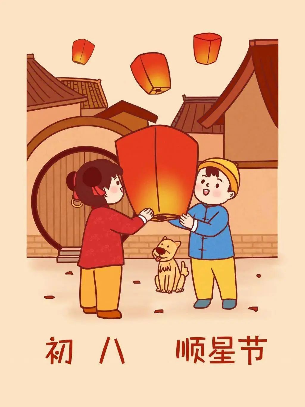 正月初八为众星下界之日,制小灯燃而祭之,称为顺星,也称“祭星”、“接星”。又传说初八是谷子的生日。这天天气晴朗,则主这一天稻谷丰收,天阴则年歉。